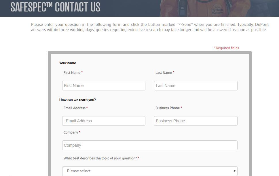 化学物質保護やクリーンルーム製品に関する追加情報や技術サポートについてデュポンにお問い合わせする必要がある場合、DuPont™ SafeSPEC™ウェブサイトから3つの方法で問い合わせることができます。
