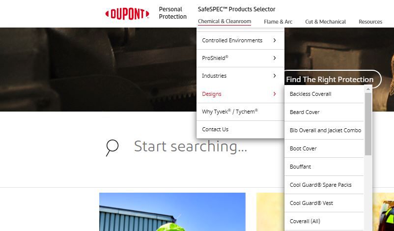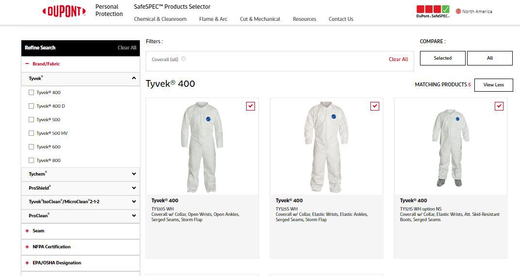 特定の化学物質保護やクリーンルーム製品の設計に興味がある場合、DuPont™ SafeSPEC™のショートカットを使用すると、オプションをすばやく特定できます。